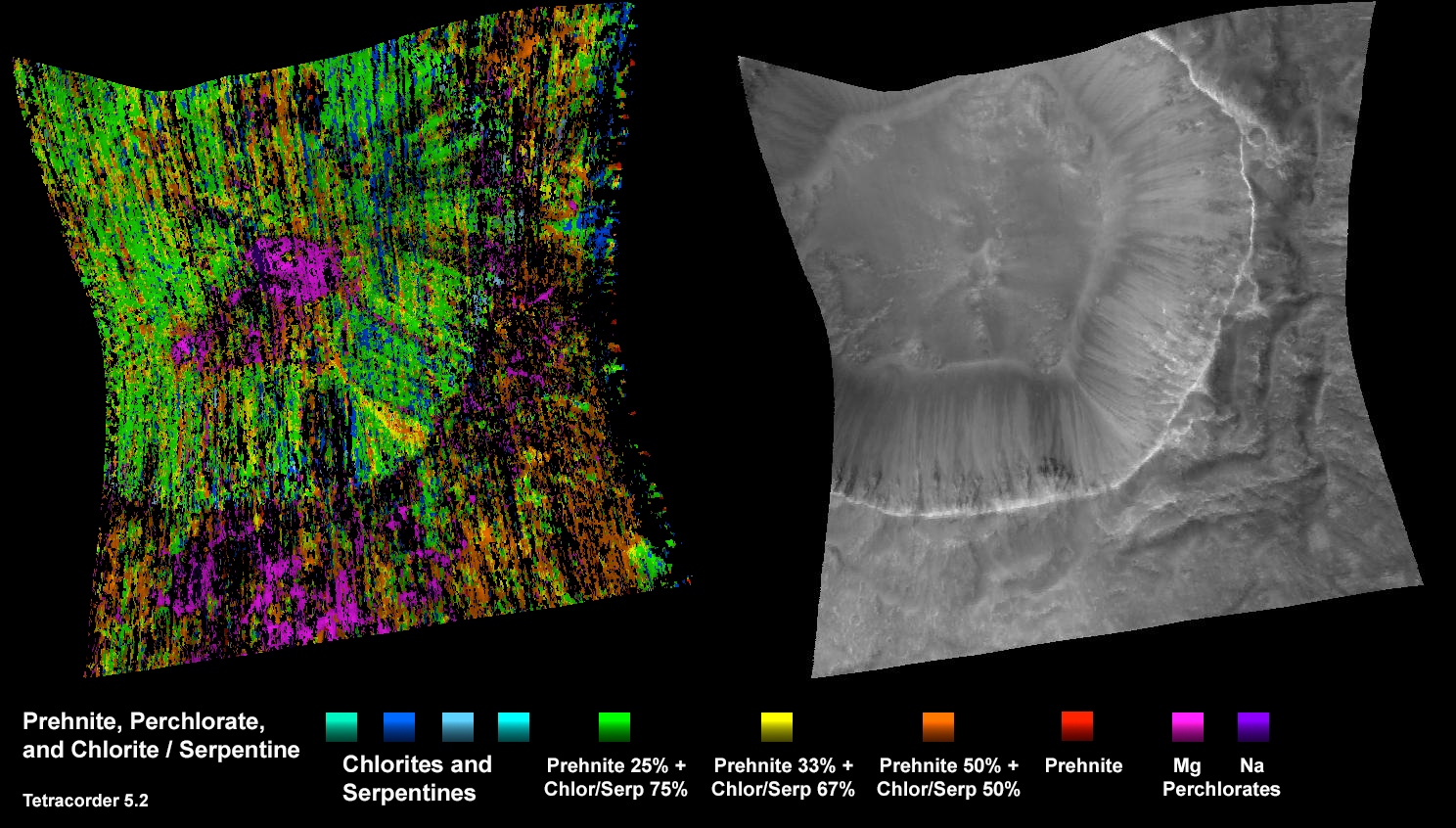 The Salton Sea region Tetracorder results are shown in Figures 1 - 5. The NASA Airborne Visible/Infrared Imaging Spectrometer (AVIRIS) system was flown in an array, the data mosaicked and calibrated to surface reflectance. The mosaic was then mapped with Tetracorder. Mapping water on the Moon is shown in Figure 6. Mapping a hydrothermal system on Earth is shown in Figure 7, and on Mars in Figure 8. Figures 9 and 10 illustrate other standard mapping products, there using data from the Compact Reconnaissance Imaging Spectrometer for Mars (CRISM) on the Mars Reconnaissance Orbiter. Example results from Tetracorder mapping in the Saturn system are shone in Figures 11 and 12.