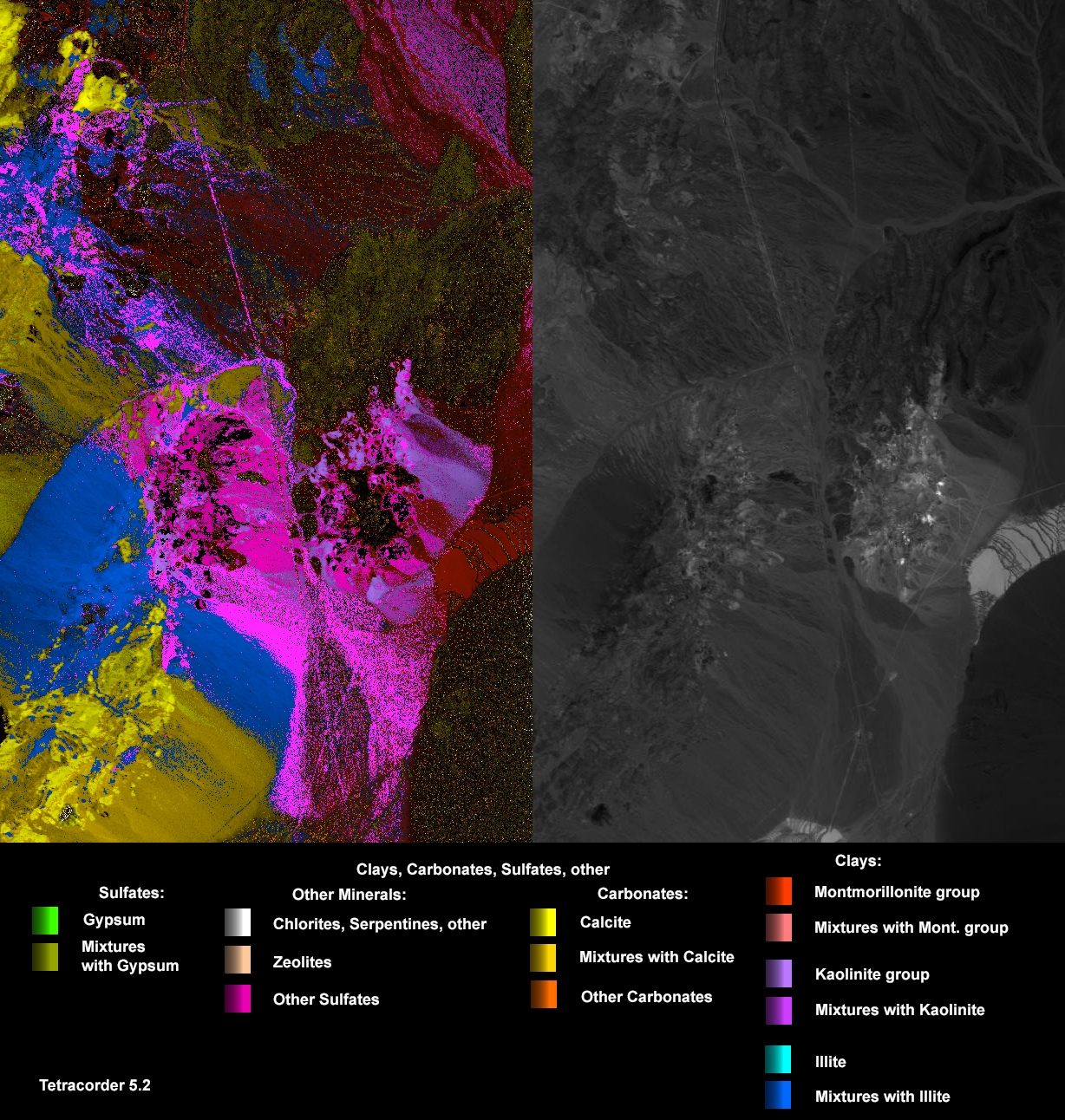 Tetracorder 5.x+ adapts to both environmental conditions as well as instrument capability. Previous versions had to be adapted by an expert spectroscopist for each sensor and environment the data came from. Tetracorder produces maps of hundreds of materials, including chemical substitutions in some minerals. Imagine doing chemistry remotely, whether across a canyon, from a high point overlooking an environmental disaster, or a studying remote planets. This is now possible. Further, Tetracorder results can be made into custom color-coded maps automatically (examples below).